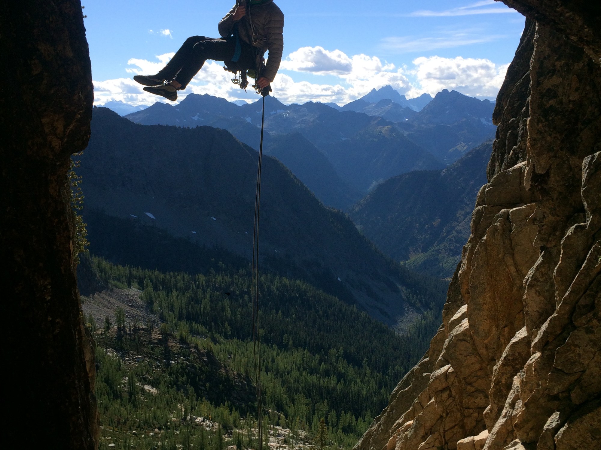 What an incredible summit! We lounged on the summit slab for 30 minutes and signed the summit register before beginning a frustrating descent, consisting of 5 windy rappels and some loose, steep gully walking. However, one of the highlights of the day was the free-hanging rappel off of the massive chockstone that we bypassed earlier in the day – awesome!