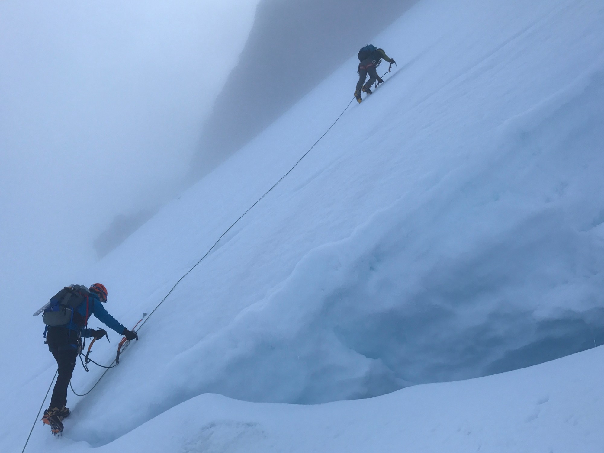I grabbed this photo near the top of the ice cliff pitch.   Look closely – you can see a team of two on the snow shoulder about 600 feet below.