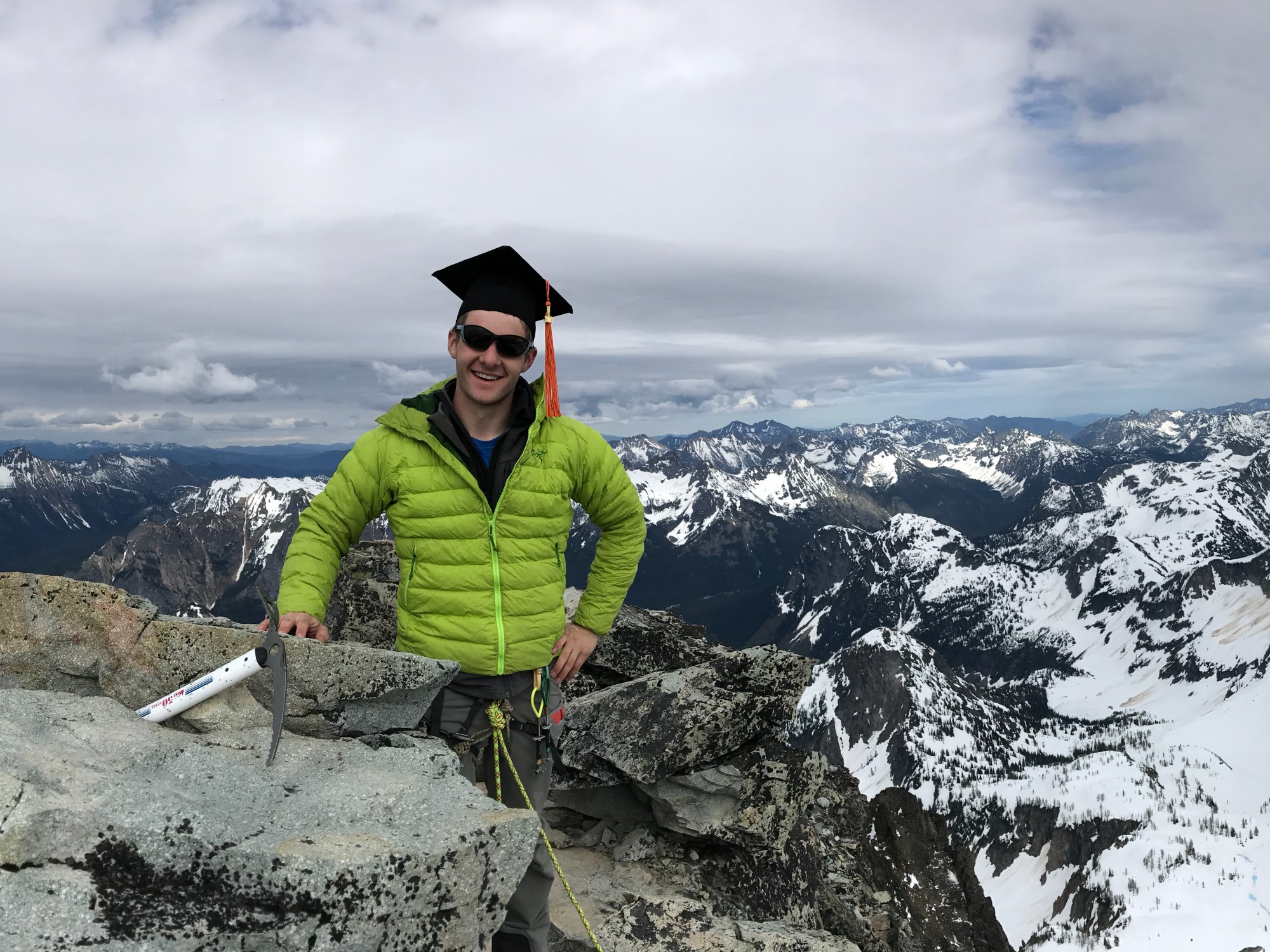 The next snow slab was equally terrible. I had Jonah put me on belay as I made a rising traverse with my crampons on – boots in the snow, hands on the rock. I reached a rock ledge and realized that the snow was taking too long. I looked at the rock cliff above me, and yelled down to Jonah. “I’m taking my crampons off and climbing up the rock here. I suggest you do the same!” A smile came on as I progressed upwards on solid rock. The climbing was about 5.5 with sparse protection, but it quickly eased off as I got near the crest of the summit ridge. I belayed Jonah as he quickly followed. Before he reached the anchor, we were already discussing how to descend. We only had a couple of minutes to spend on the summit before we had to start down – storm clouds were approaching. We snagged a few photos with Jonah’s grad cap, stowed the rope, and went to work on the descent.