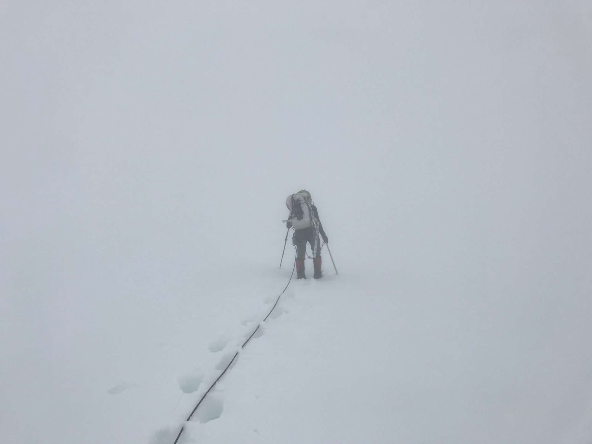 Moving up the glacier with such bad visibility was a unique experience. We did spot several crevasses on the left side of the glacier and made sure to stick to the right side. With no depth perception, I had to poke my trekking pole around in front of me to determine where I needed to kick the next step. Despite this, we made good time up the glacier and finally arrived at Silver Star Col, which separates the higher East summit from the West summit.