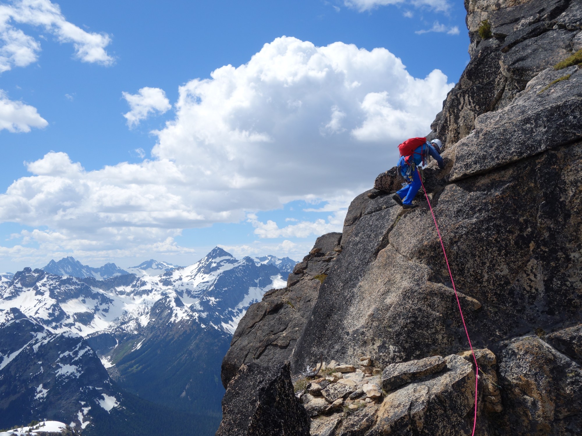 Once we broke out of the trees, we followed a well-defined trail until we gained the lower flanks of the mountain, avoiding most of the snow. With some stout 4th class scrambling, we joined the “left-hand gully,” which is the traditional approach to the ridge crest. We joined the gully fairly high, where the snow had already melted out for the summer, so we cached our crampons, ice axes and some other gear before continuing the scramble up to the notch.