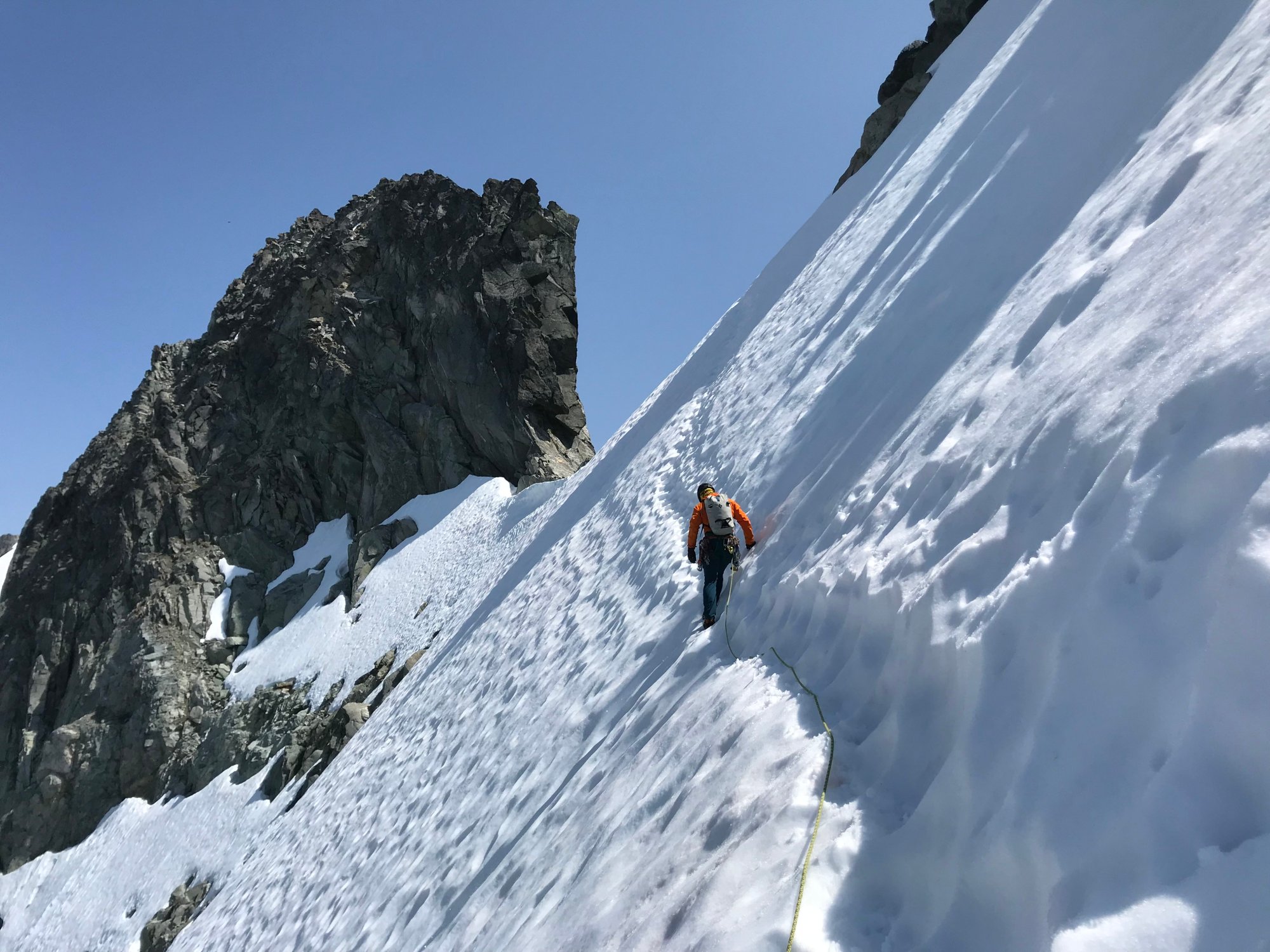 We traversed on the Forbidden Glacier for a time until we regained the rock on the ridge. Several simulclimbing blocks with some fun but loose climbing brought us to the part of the traverse I had been dreading: the steep snow traverse. This part of the route requires a traverse on 50° snow/ice slope. There is a bypass route mentioned in other trip reports, but there were old boot prints in the slope, so we decided to give the traverse a go.