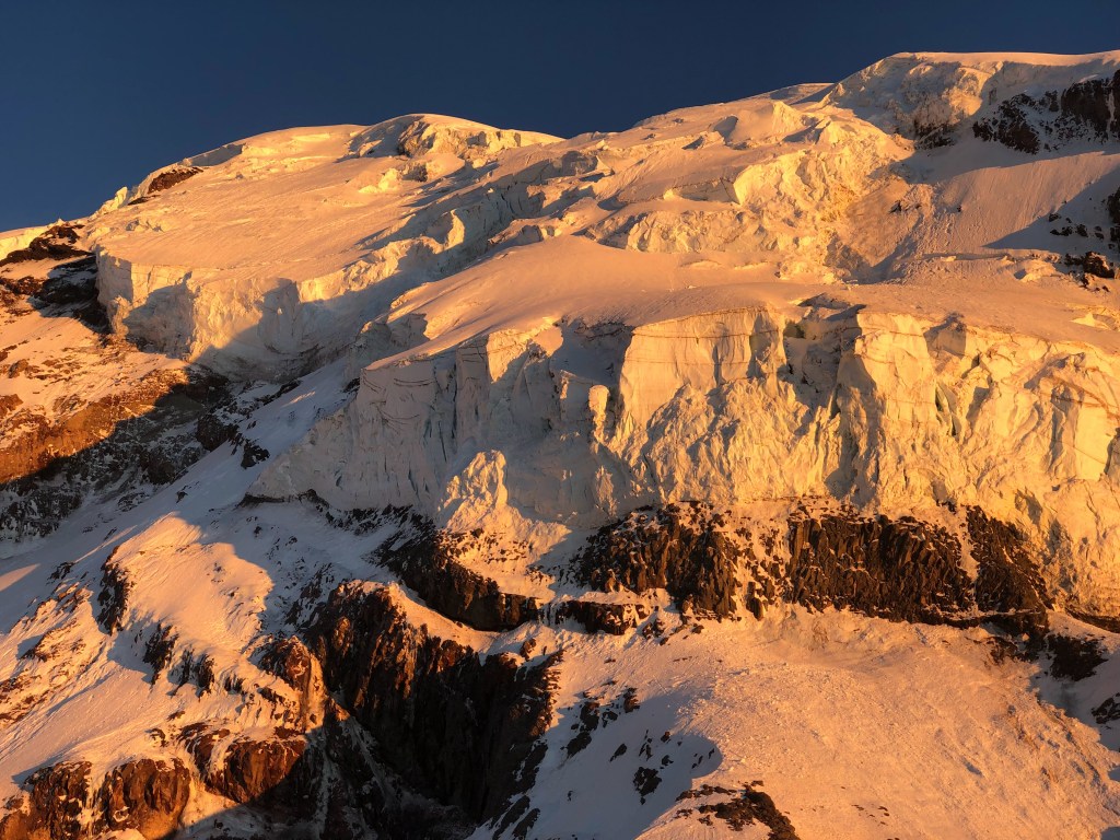 The haul to 10,300 high camp was easily done in a single day for us, but many choose to break this into two days – either option is reasonable. Be picky about when you attempt this route; insist on cold conditions. You will be climbing below decomposing volcanic cliffs until you top out the technical difficulties at ~12,200′. My personal risk tolerance dictates that I would not climb this route with an overnight freezing level higher than 12,000′. Even in cold conditions, start early so you can get out from under the cliffs before the sun roasts them too much.