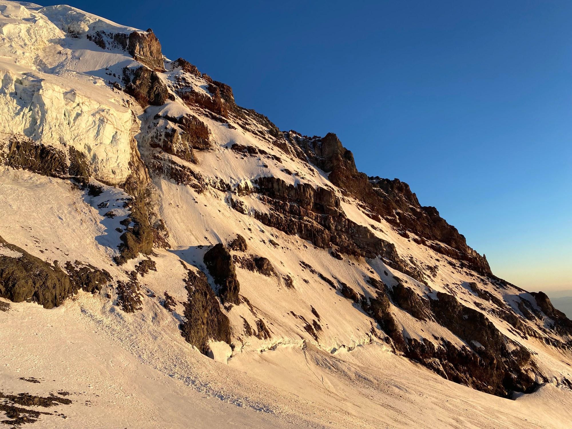 Karsten taking point on a big simul block of 60 degree ice. The rock bastion above is by far the best rock I’ve seen on Rainier. Finally, we were under something that didn’t look like it was going to topple over at any moment!