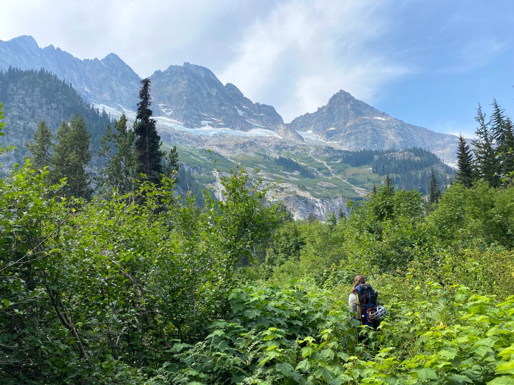 Nellie in the bushwhack section of the approach with the summit of Mt Goode 6000 feet above.