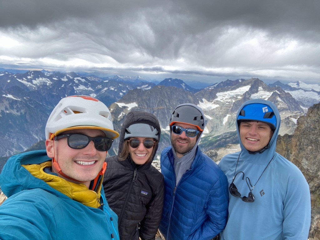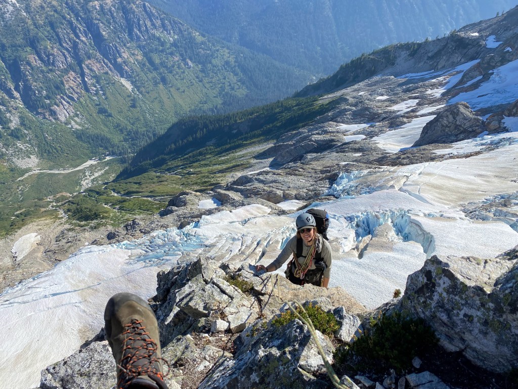 The Northeast Buttress is a striking line on the most impressive face of Mt Goode, which is the highest peak in North Cascades National Park. This route has all the features of a true classic Cascades adventure climb… it’s rugged! 40ish miles of hiking, a glacier, plenty of scrambling and a very long rock climb… all the things I need to make a weekend feel complete. Nellie and I hit the trail from Highway 20 early on Saturday in an attempt to beat the heat. Nellie is an experienced ultralight backpacker and was a great partner for this trip, where bringing the absolute lightest kit possible is key. We met earlier this year at 14,000 foot camp on Denali where she was running a medical research expedition. It was great to reconnect in the mountains! After ~15 miles of hiking, we forded the North Fork of Bridge Creek and scrambled up to a bivy just below the Goode Glacier. As we got ready for bed, my good friends Eric and Darren from Spokane came around the corner. It’s always a welcome surprise to see friends in the mountains! They had dinner and hung out for a bit, then continued up to a slightly higher bivy location.