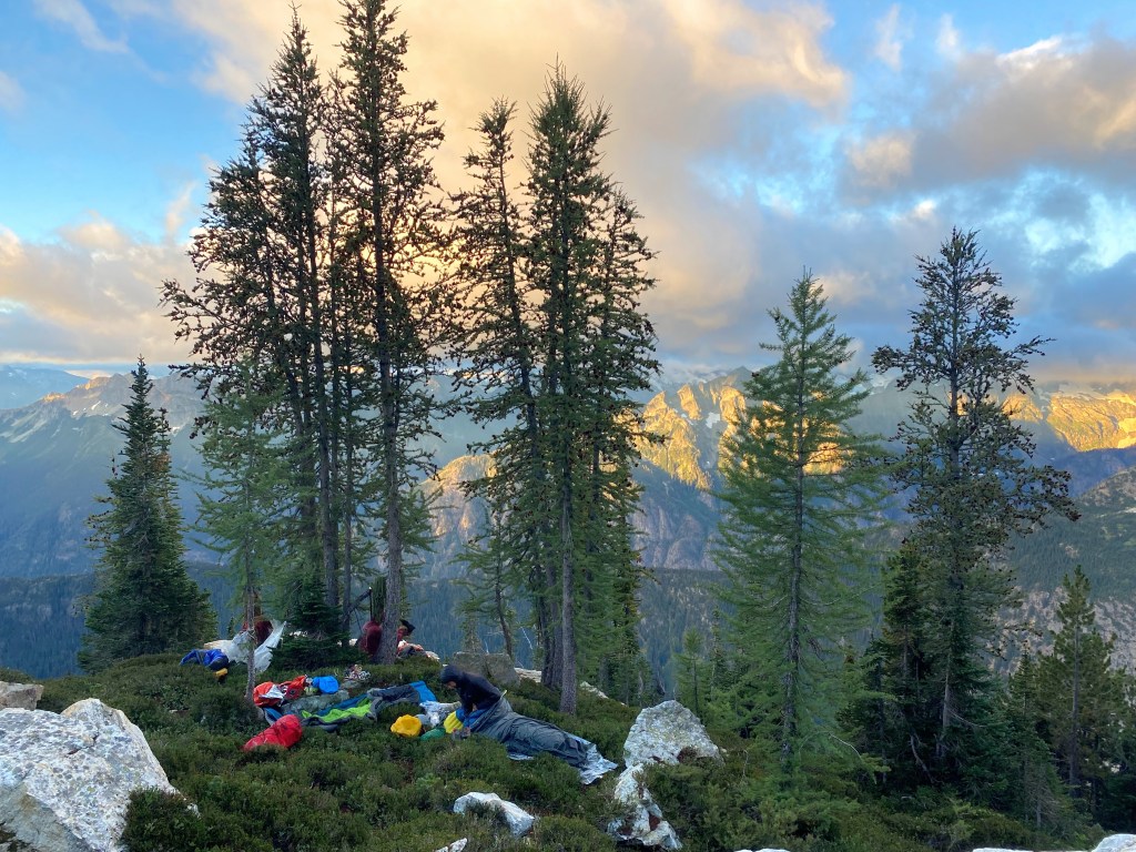 Once done with the technical portion of the descent, there is still more than 4000 feet of off-trail mountainous terrain to reach the valley bottom. We got benighted about 1500 feet above the valley floor and chose to bivy rather wander around this highly consequential, wet terrain. We had kind of a rough night here with no real shelter and no flat places to lay down. I found the friendliest and flattest piece of ground I could, tucking myself between a tree and hummock of heather. The storm seemed to come and go overnight. I would get close to falling alseep until the wind and rain occasionally kicked up, sending me into defensive mode as I fought to keep myself dry. Everyone managed at least two hours of sleep… not bad given the situation.