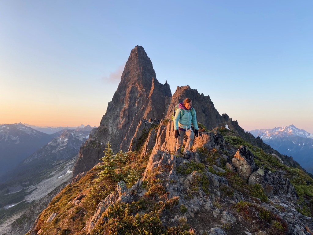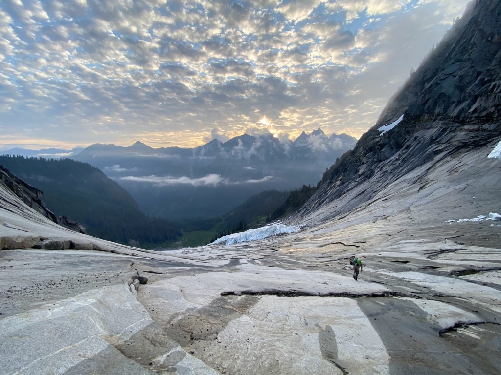 A 3am start and spirited churn up the Slesse Memorial Trail brought us to the propeller cairn, where debris from the 1956 crash of flight 810 have been collected into an impromptu memorial. With our water supply topped off, we began traversing glacial slabs through a notch in the East ridge which required some very loose fourth class downclimbing – spooky in spots! In the next cirque, the bypass glacier had mostly slid off the mountain and allowed us to traverse another section of glacier-polished rock to gain the obvious ramp that brought us to the ridge crest.
