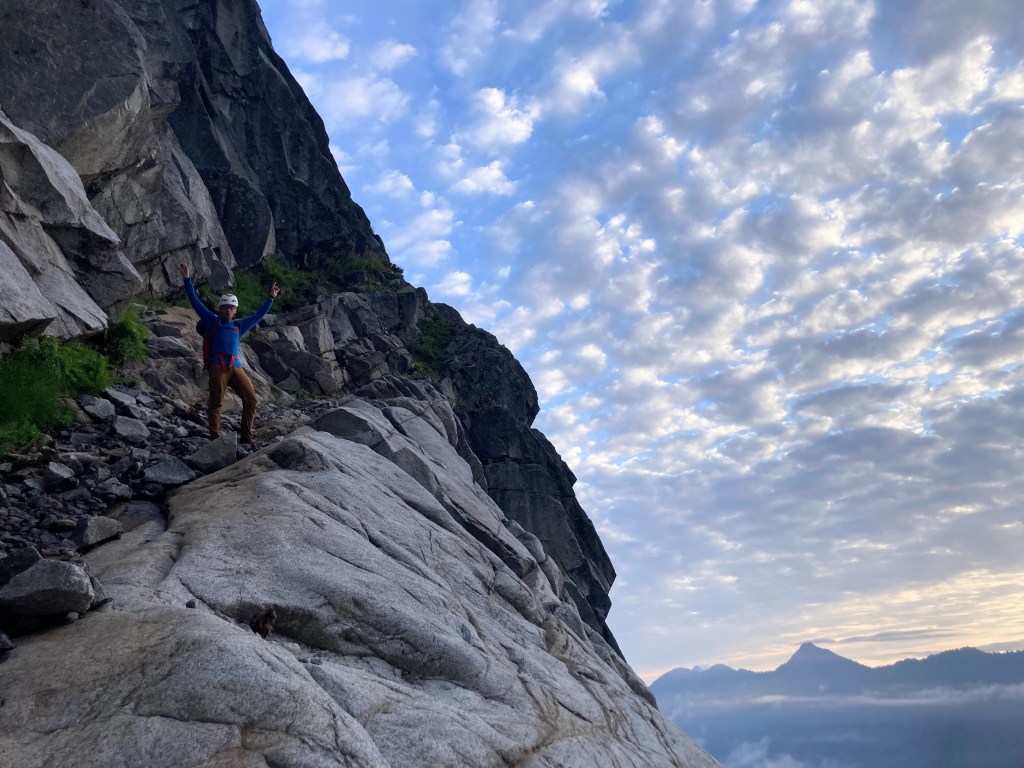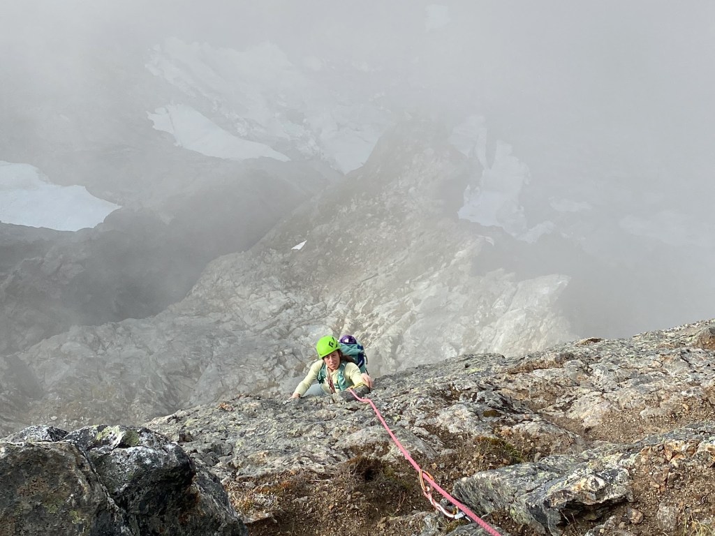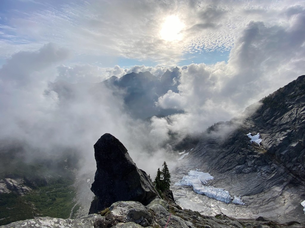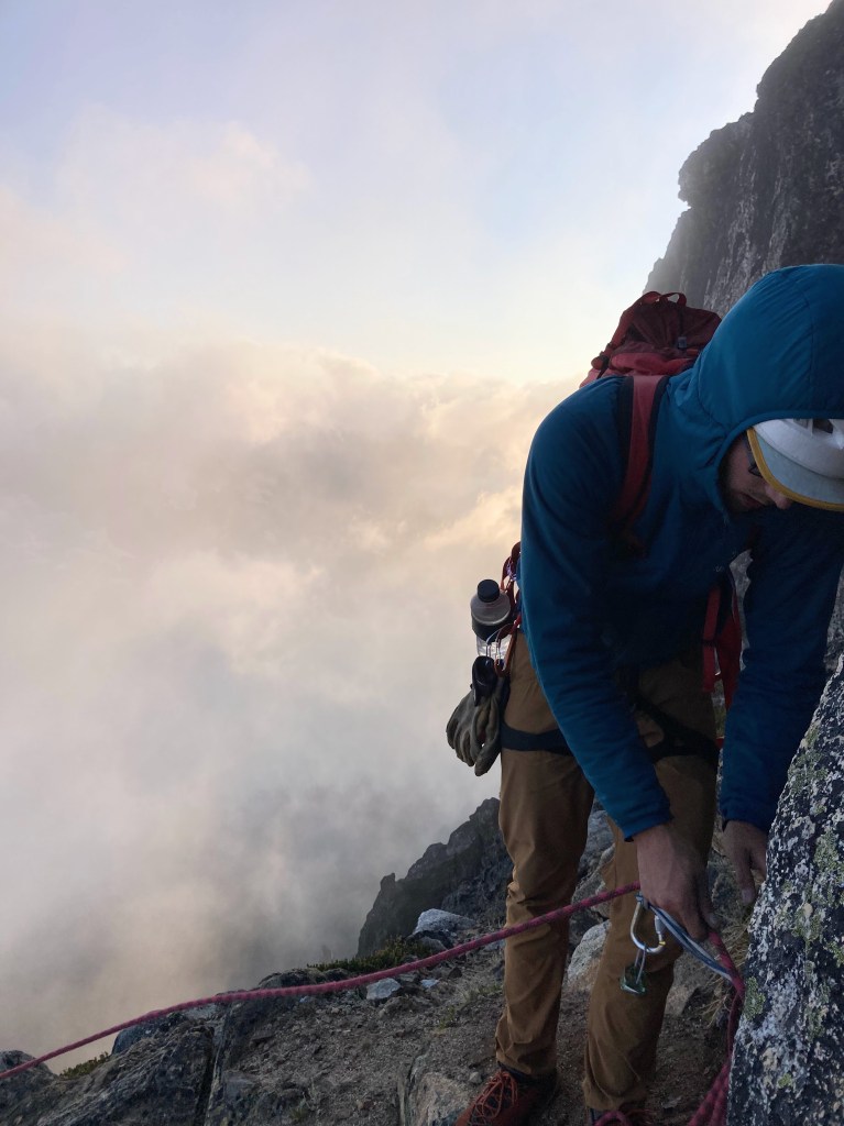 I couldn’t help but smile every time I had a chance to soak in a moment on the upper route. We found ouselves in a swirling sea of clouds, cruising one of the great routes of the Cascades without another human in sight. When the mountains give us their gifts, they are given so lavishly! I could go on about the climbing: our path to the sky required countless pitches of distinctly alpine rock sustained at 5.7-5.9. More memorable to me than the climbing itself was the experience of efficiently covering this terrain on this wild peak with a good friend. Avi and I got lost in the rhythm of our ascent.