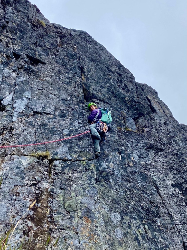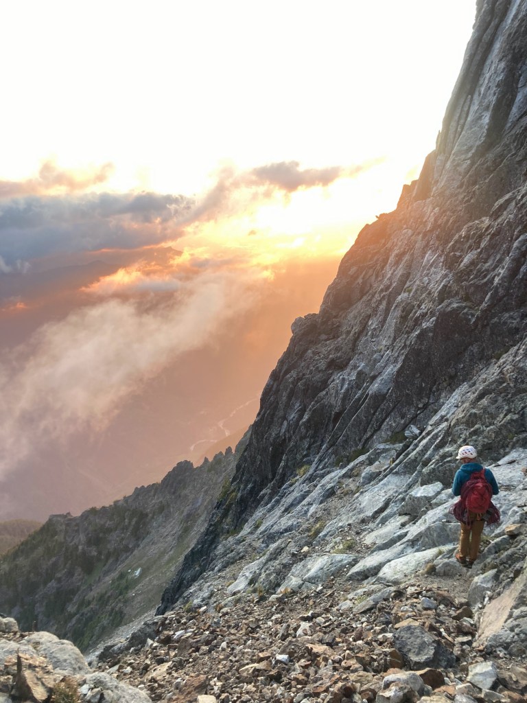 A set of nuts and single rack .2-3 with doubles of .4-1 is perfect for this route. I highly recommend a 70m rope – a lot of the rappels will require fifth class downclimbing if you bring anything less. We had recent beta and did not carry crampons or ice axes.