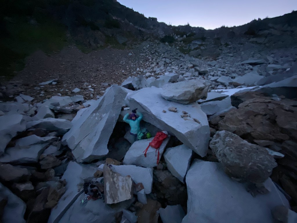 The descent from Mt Slesse not too hard, but it’s long and nearly impossible to find the route to Crossover Pass in the dark. We spent hours downclimbing, rappelling, and speed hiking, passing perfect bivy sites where we easily could have tucked in for the night. With no bivy gear other than an extra jacket, we charged on for another couple of hours hoping we could somehow find the route down. Eventually, some scary moments on a scree slope convinced us to bivy around midnight. With a full moon, we wandered around a boulder field until we found our best option for shelter from the wind: a cave feature formed by large talus. We spent the night shivering in the fetal position whenever we weren’t doing calisthenics in an attempt to generate warmth. I grumbled and complained the whole time… Avi gritted out the night in silence. Respect.