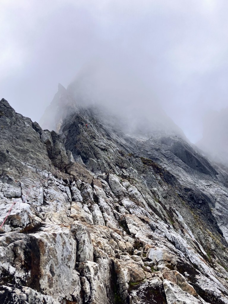 After Avi brought me up to a belay near the summit, we reviewed our route descriptions and realized that we had a fourth class bypass option out left, or more technical climbing straight up the crest. Poor visibility made it hard to tell how much further we had to go; it was late in the day and we needed to get up and off as quickly as possible. My experience tells me that it can often be faster to climb more direct technical terrain than it is to go out of your way on mungy fourth class bypass options, so I took the rack and charged upward with renewed vigor. I ended up climbing a 100+ meter simul pitch up to 5.8 here. We both crested the summit in a total whiteout at 7pm, feeling no sense of relief or accomplishment yet. We were facing down a notoriously difficult and long descent with dwindling daylight.