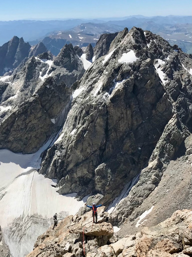 Above the Black Face, we had one more steep pitch before the climbing mellowed to low fifth class. Now in simulclimbing mode, we blasted six more pitches until unroping and scrambling to the summit of the Grand Teton. Miraculously, there wasn’t a breath of wind nor a cloud in the sky. Awesome! The descent of the Owen-Spalding is involved and sometimes confusing, but we got it done with persistence and helpful beta from some Exum guides that we passed near the top of Sargent’s Chimney.