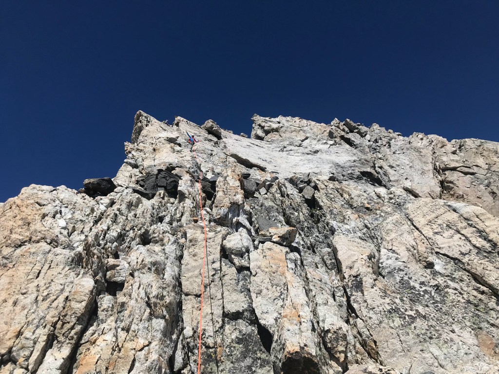 Once we roped up, we got caught behind a few teams which slowed our progress. When finding yourself in this situation, it’s good to adjust your expectations and not stress too much about the time you’re losing. However, if you find yourself holding up another, obviously faster team, it’s good style to let them pass. Regardless, we romped upward with Kyle letting me lead nearly every pitch. The clear money pitch of the route was pitch 5, the Black Face, with spectacular steepness and exposure for such a moderate grade. I must have clipped 5 or more pitons on this pitch – alpine sport climbing!