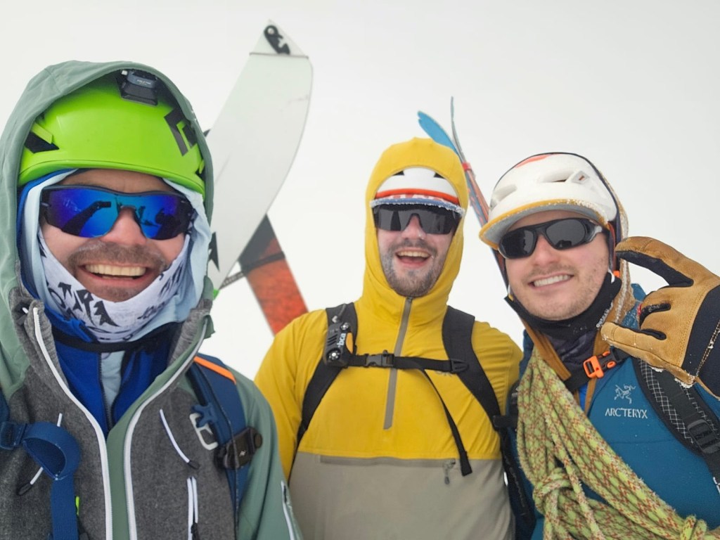 Cory went first, executing beautiful turns through the upper and lower cruxes which are split by some more mellow terrain. Greg went next on his splitboard, and I went last. I side slipped the upper crux, then made a handful of exciting turns in the central part of the chute. After side-slipping the lower crux, I removed my skis and walked back across the rock step. This was a huge moment – we still had 6000 feet of complicated terrain to ski down, but the most dangerous and technical terrain was behind us.