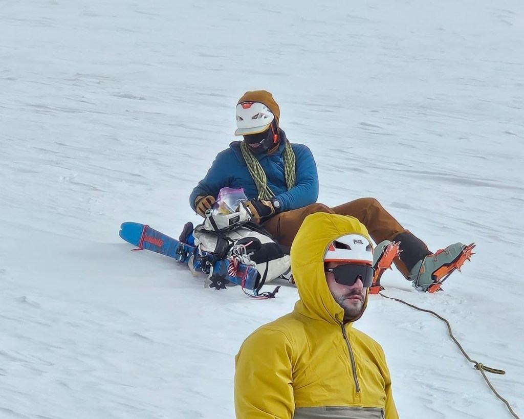 After reaching the summit, we dropped down into the crater to get out of the worst of the wind and take a break. A key part of ski mountaineering strategy is to time your descent correctly: start down too early, and the snow will be frozen and dangerous. Too late, and the snow will be too warm and heavy to make for good skiing. It’s impossible to nail conditions on the entirety of an almost-10,000 foot ski descent, but we wanted the upper mountain and especially the Kautz ice chute to soften up for us. After we found a good spot, we each put on all of the clothing we had and sat down to eat some food. Comically, we all completely fell asleep during this snack break. After an hour or so, Greg shivered himself awake and roused the team. We all had a laugh at how ridiculous it was to accidentally fall asleep on the summit of a massive, glaciated peak. I still had a half-eaten burrito in my hand when I opened my eyes! It was time to pack up and go skiing.