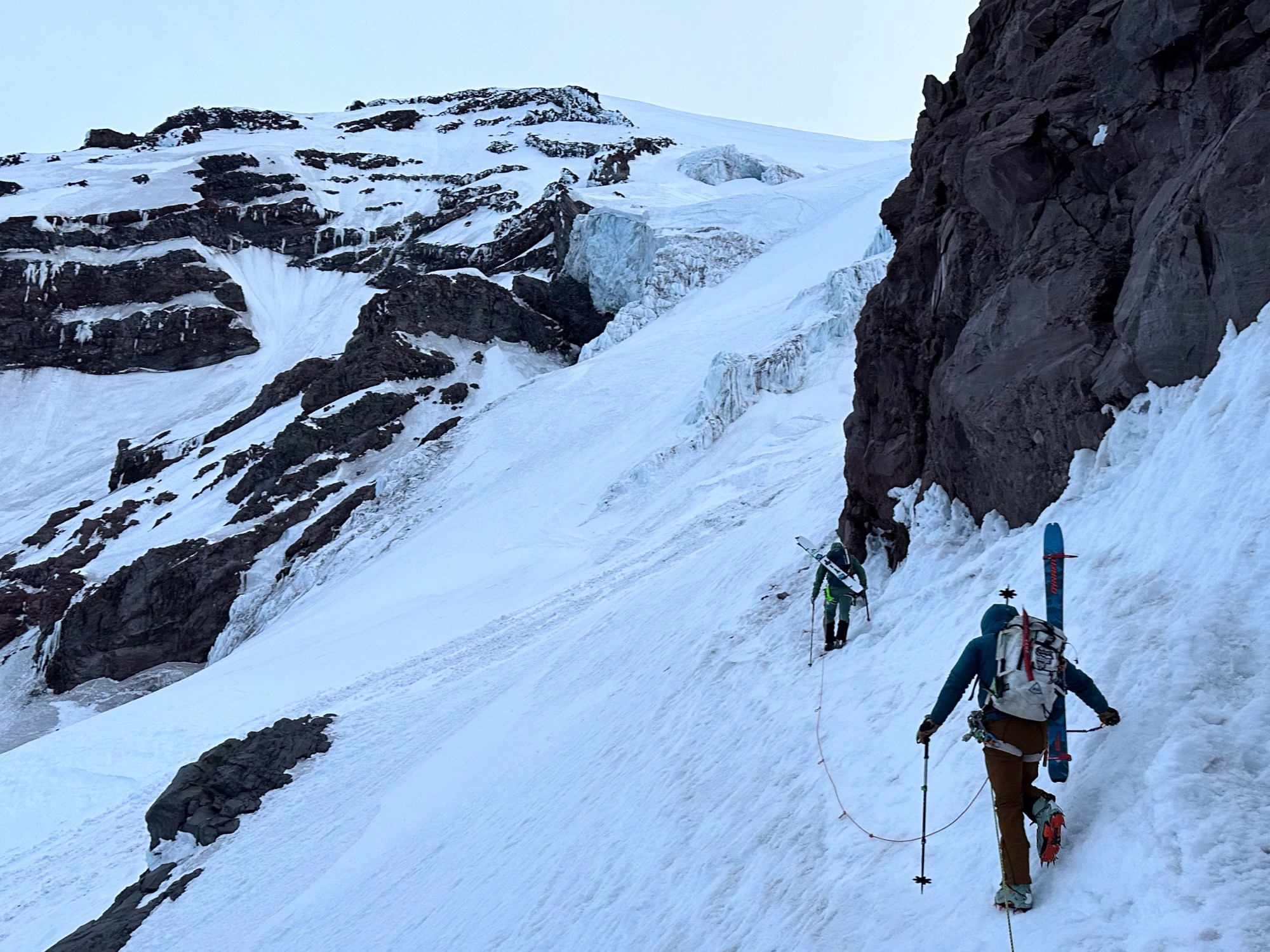 A few hours into the day, I was finding my stride and we were making great time. We’d already crossed the Wilson Glacier and ascended the Fan, but I was feeling rather intimidated by this whole endeavor. I knew the terrain above would only get more serious and I was questioning if I had the skills on skis for this business. As we reached 8,000 feet, the snow had refrozen to the point that skinning on steep slopes above crevasses was losing its appeal. We took off our skis and I instantly felt more relaxed as I felt the reassuring bite of boot crampons into the snow. Travel on the frozen surface was quick and we dropped off the “rock step” at 11,200 feet right at first light. There was so much snow that we simply walked onto the glacier where most parties have to rappel due to steep, exposed rock.
