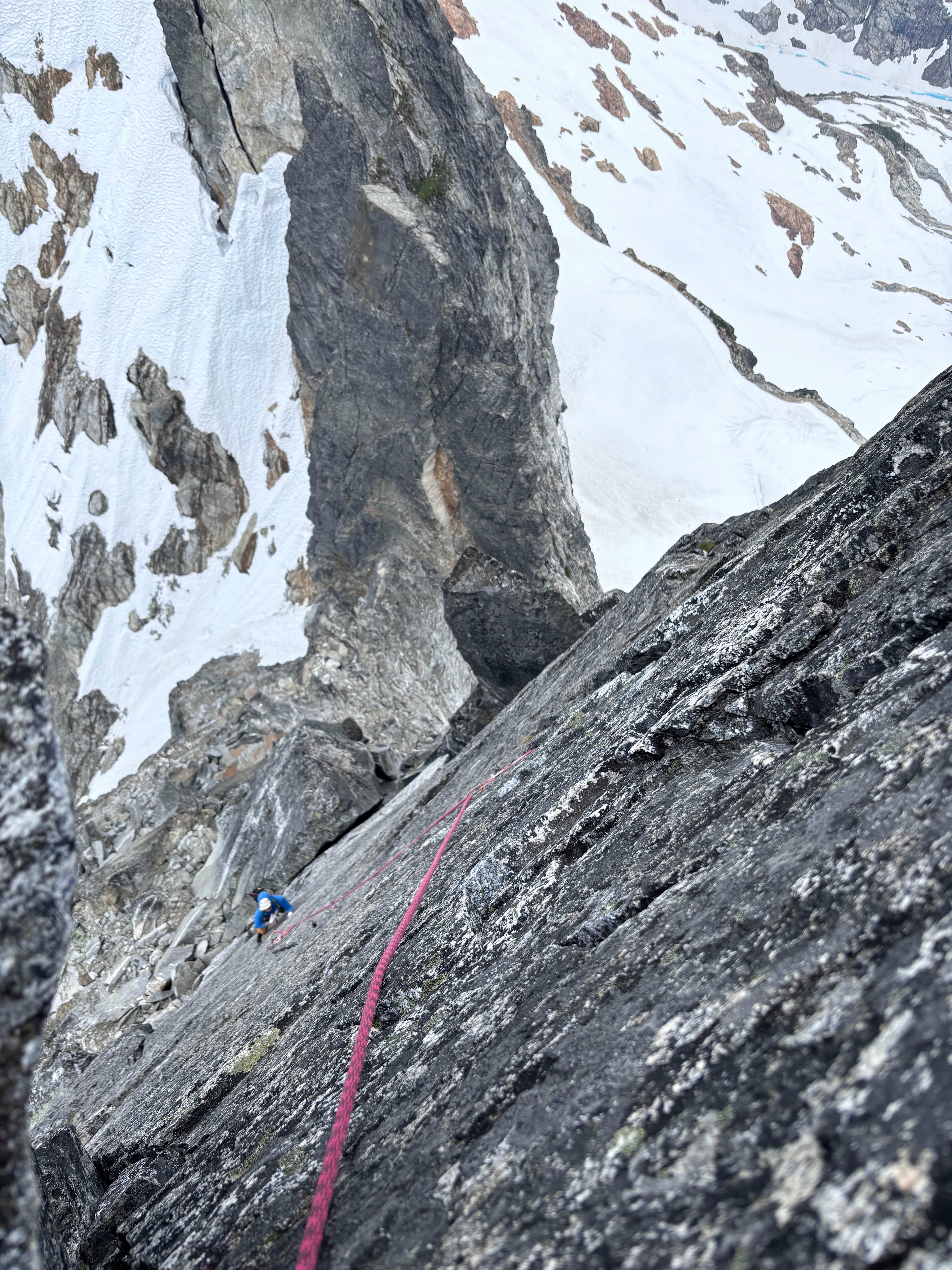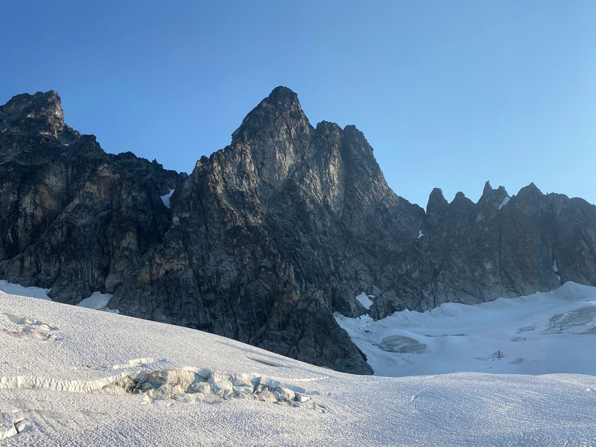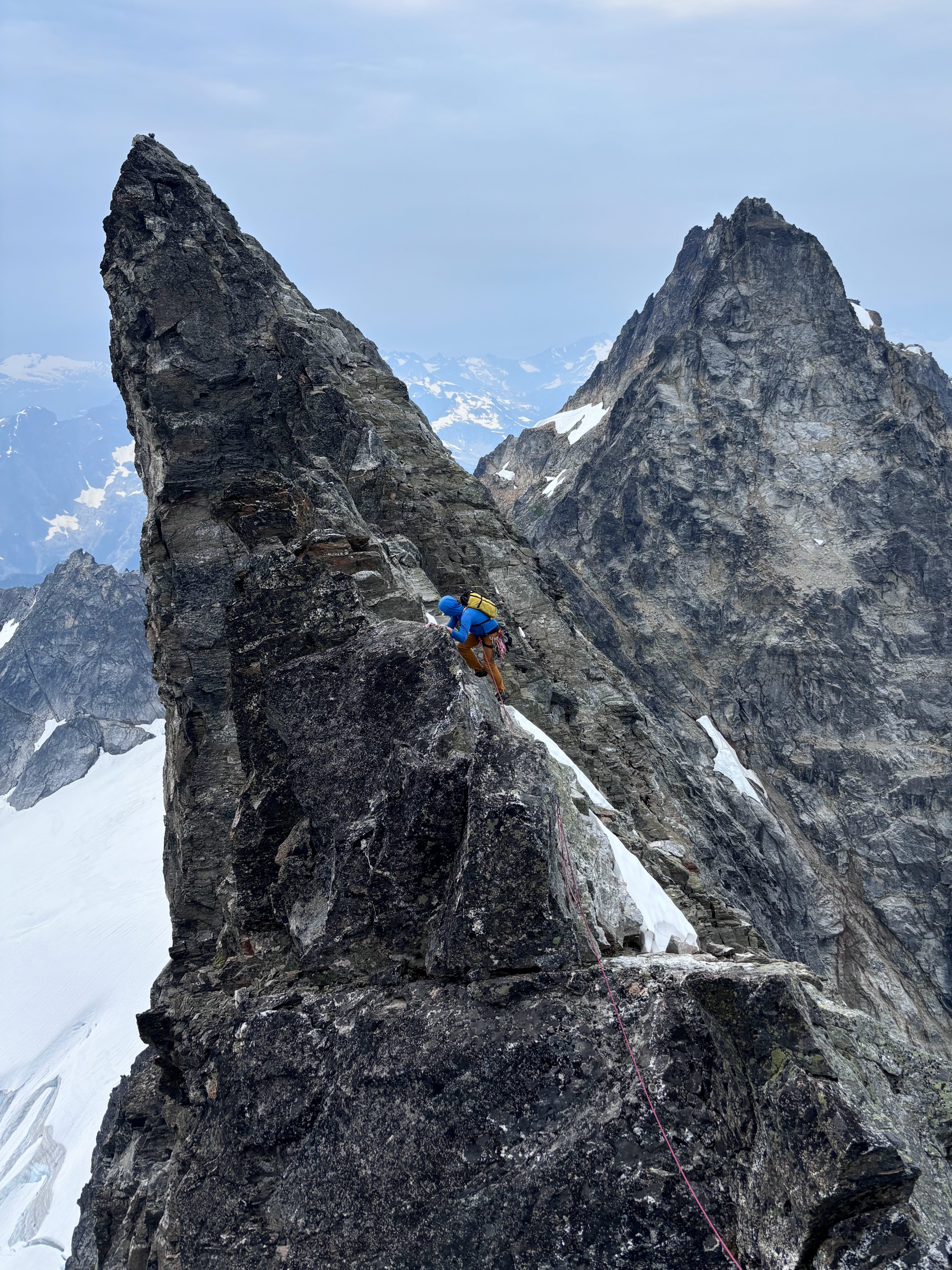 The Cascade Range is known for tough approaches, rugged glaciers and spectacular peaks. Within the Cascades, there’s one sub-range that exemplifies these traits more than any other: the Picket Range. Early in my alpine climbing career, the legends and lore of the Pickets simultaneously created an irresistible pull and true intimidation. Fred Beckey – the cultural figurehead of Cascades climbing – wrote “The Picket Range has remained the wildest and most unexplored region in the North Cascades. It is not an area for the wilderness novice. The length of climbs, combined with steep mixed terrain and variable conditions, demand all around competence and fitness.” With a decade of mountain experience under my belt, it was time to experience the Pickets for myself. Avi Baehr and I climbed Inspiration Peak via the East Ridge on July 21, 2024.