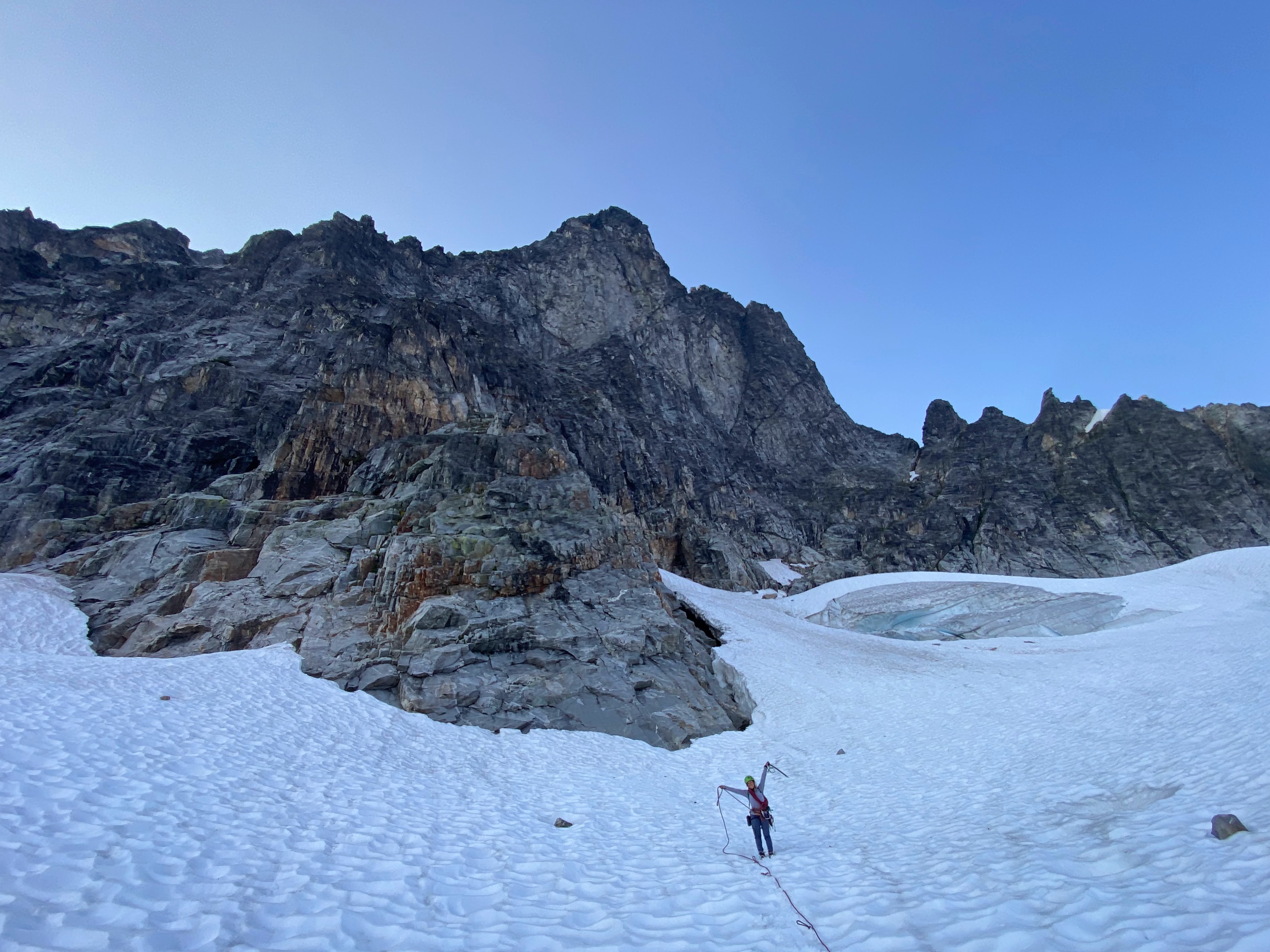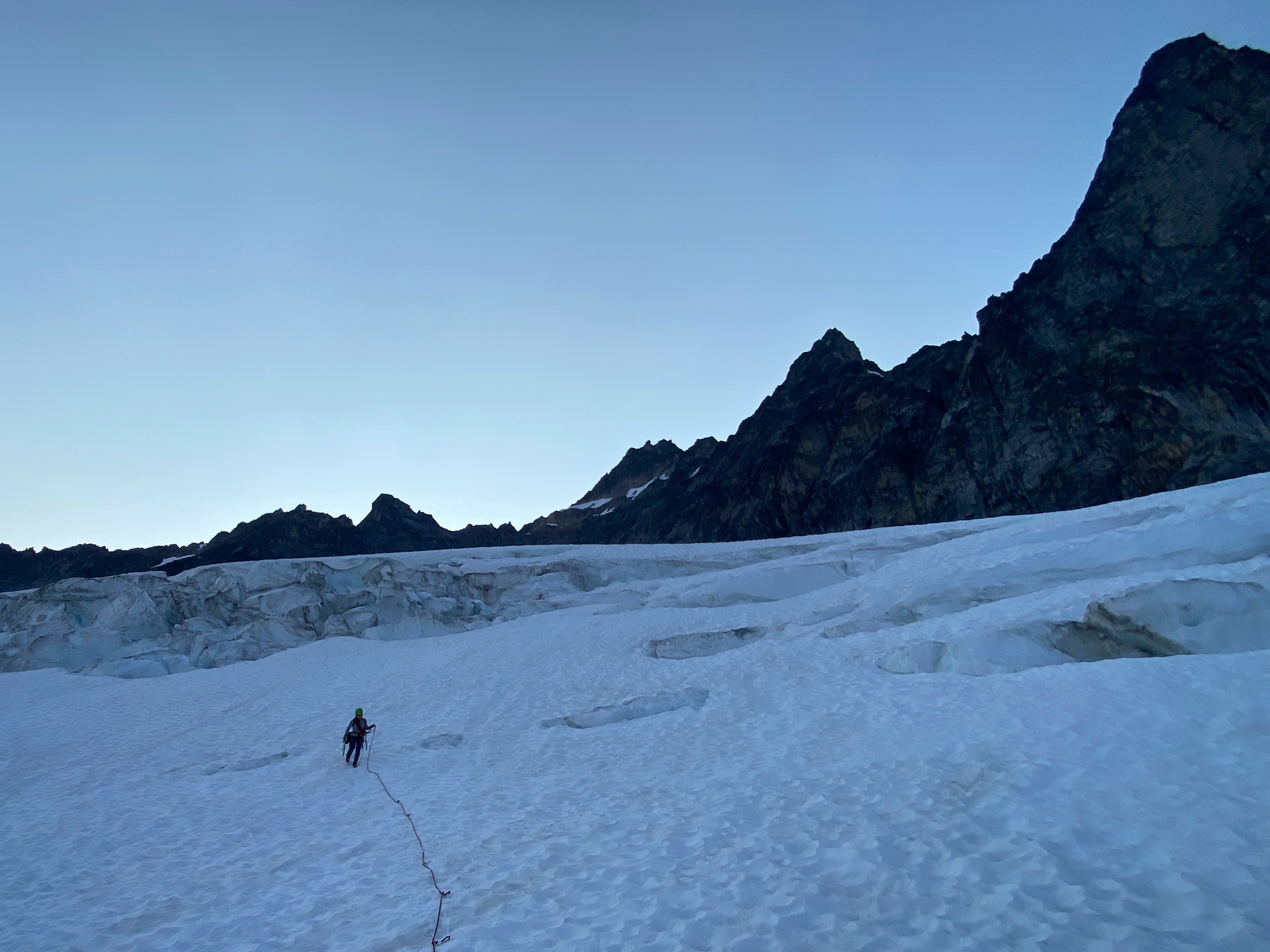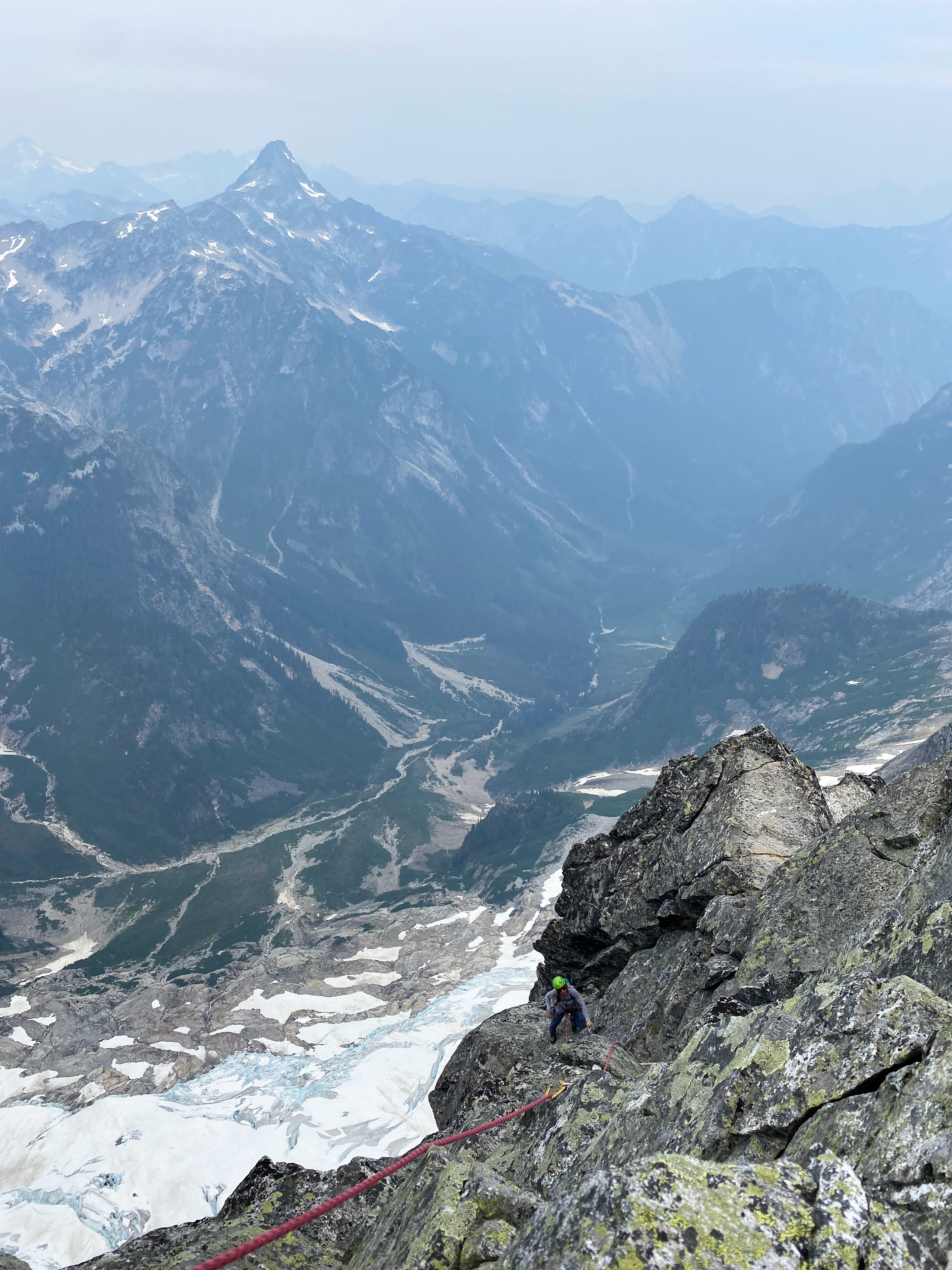 The Cascade Range is known for tough approaches, rugged glaciers and spectacular peaks. Within the Cascades, there’s one sub-range that exemplifies these traits more than any other: the Picket Range. Early in my alpine climbing career, the legends and lore of the Pickets simultaneously created an irresistible pull and true intimidation. Fred Beckey – the cultural figurehead of Cascades climbing – wrote “The Picket Range has remained the wildest and most unexplored region in the North Cascades. It is not an area for the wilderness novice. The length of climbs, combined with steep mixed terrain and variable conditions, demand all around competence and fitness.” With a decade of mountain experience under my belt, it was time to experience the Pickets for myself. Avi Baehr and I climbed Inspiration Peak via the East Ridge on July 21, 2024.