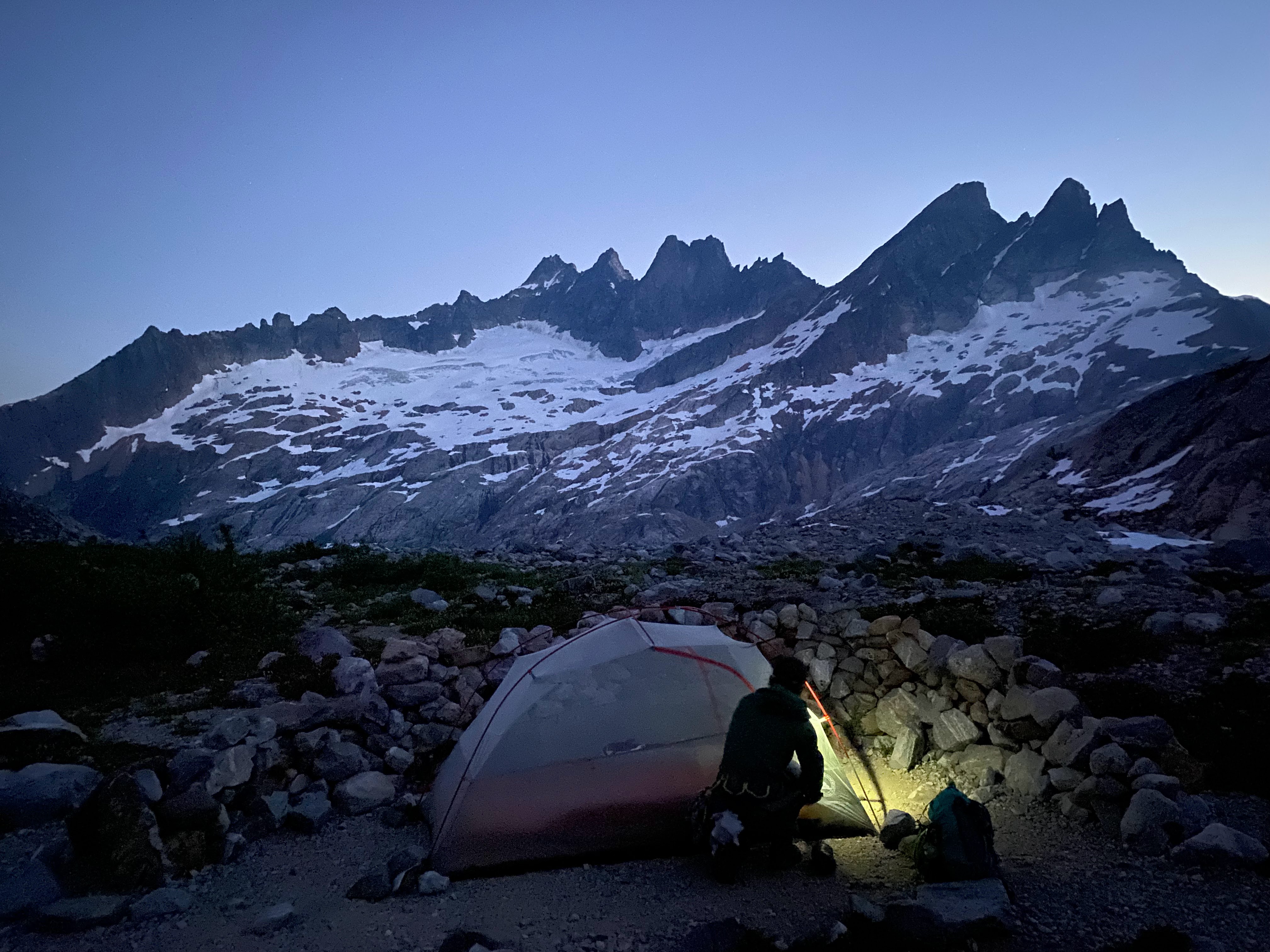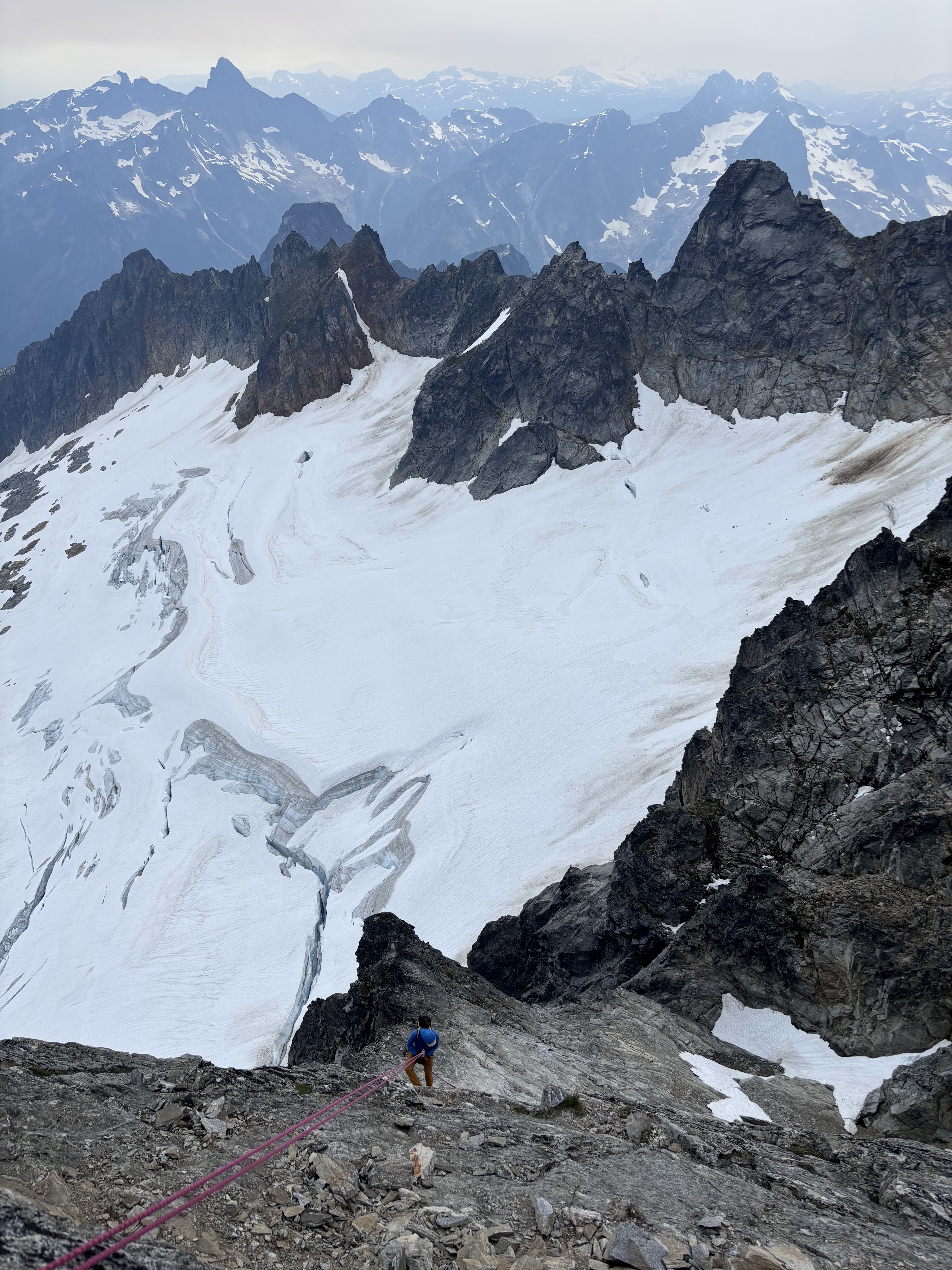 The pitter-patter of rain drops convinced us to spend as little time as possible on the summit. The descent from Inspiration is somewhat long and complicated, but not too bad aside from some serious rockfall potential – be cautious. With a single 70 meter rope, we made five rappels down the upper West Ridge before briefly putting the rope away to scramble down to a notch. From this notch, we made nine more rappels down the South face which sometimes required traversing hard one direction or the other. The traversing nature of some rappels is a pain, but it does mitigate some of the rockfall hazard – just keep your head on a swivel to avoid missing any stations. The final rappel used every bit of rope we had to land on a nice, flat spot on the glacier where we put on crampons and roped up for the glacier descent and hike back to camp, where we arrived just after dark for an 18 hour day.