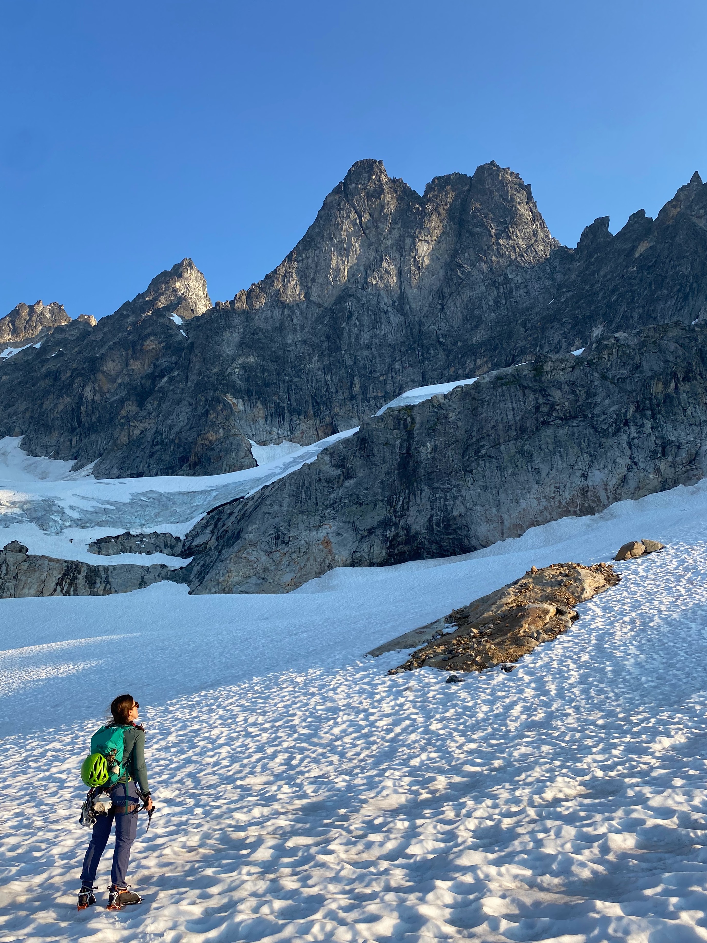 -For pretty much all alpine rock routes in the Cascades, I prefer to use a highly breathable approach shoe like the La Sportiva TX3 along with aluminum crampons as my approach footwear. It was exceedingly hot during this trip and I really appreciated the breathability on the big hiking days. I find that Goretex or leather approach shoes tend to get wet and stay wet on multi-day trips, while breathable shoes will get wet and dry out relatively quickly.