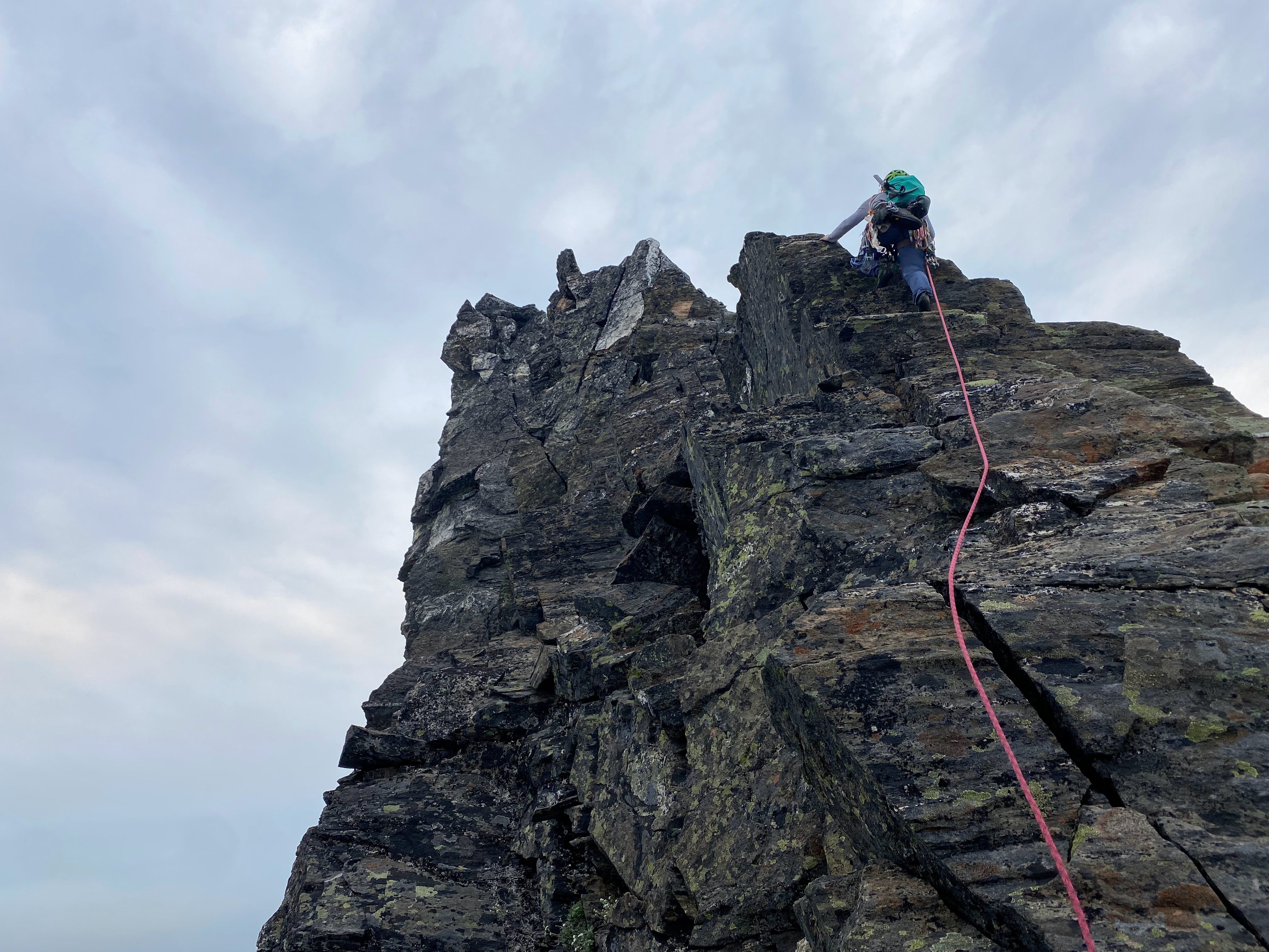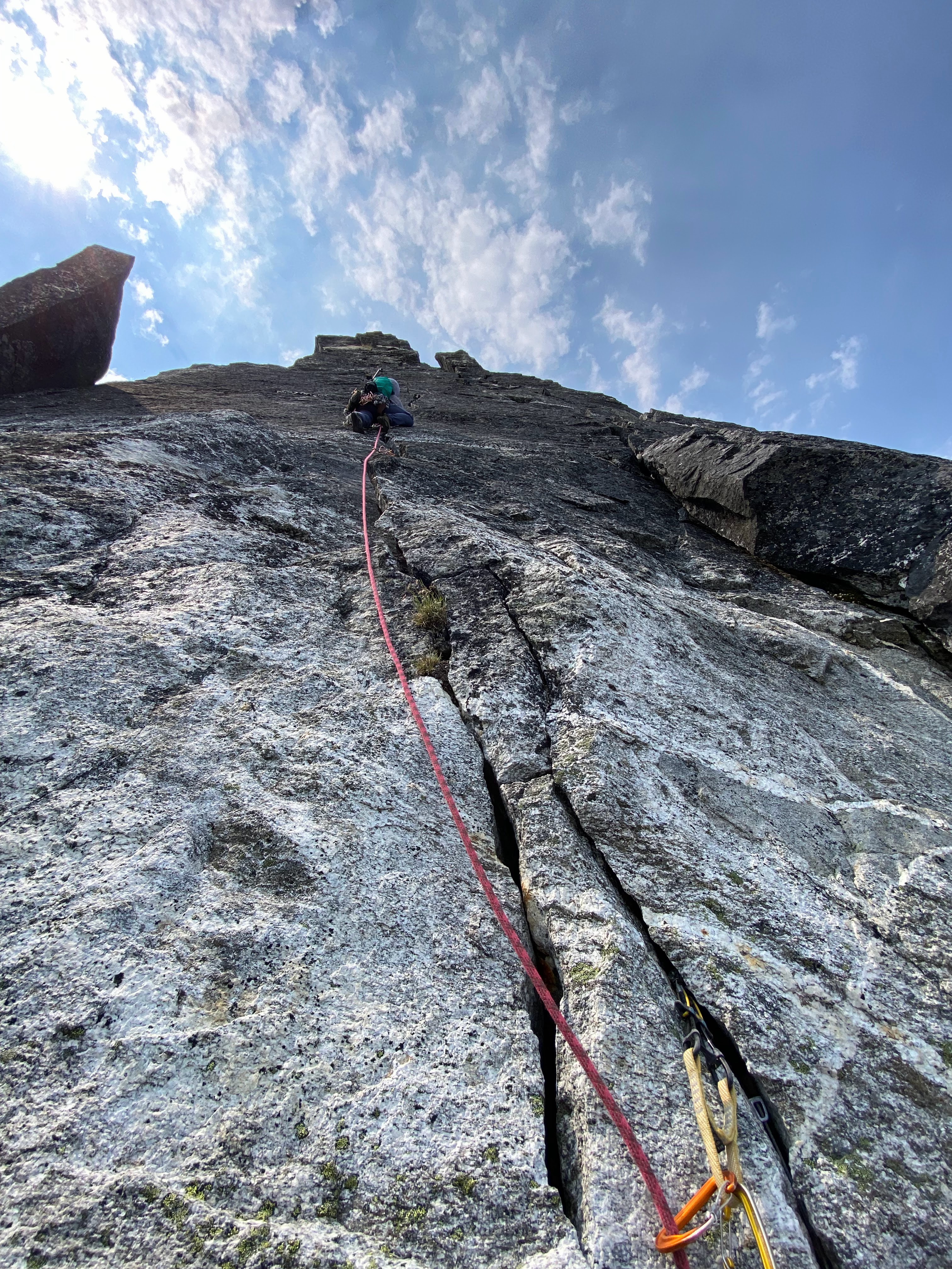 Above the crux, the quality of the climbing goes down slightly but the position up high on the summit ridgeline is unbelievable. Swapping leads on four more fun, moderate pitches took us to the summit 8 hours after we started the route.