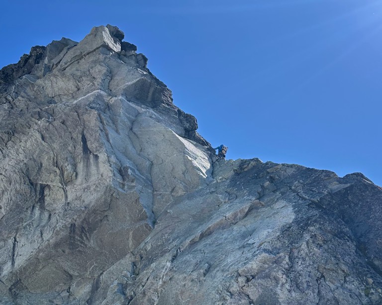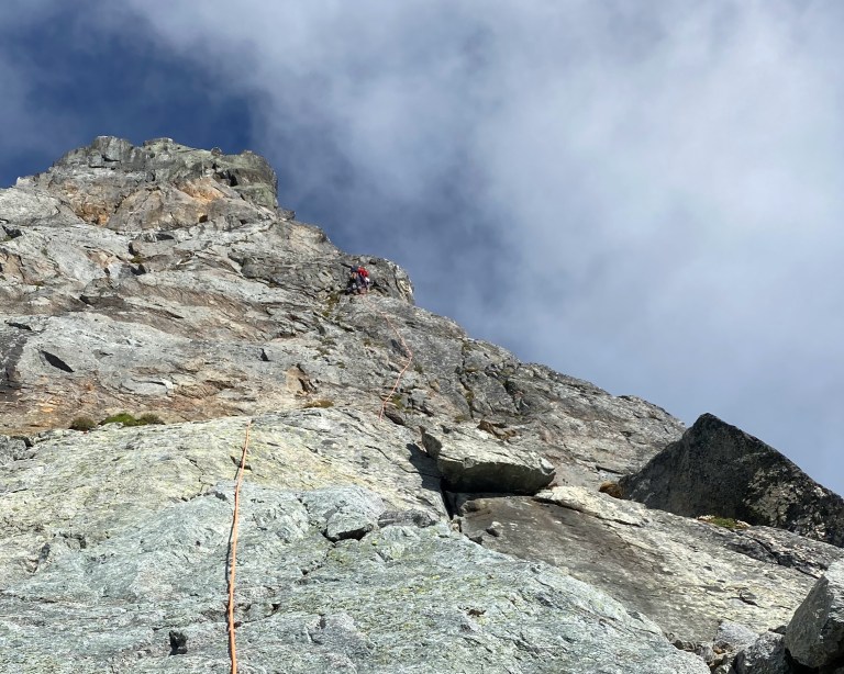 Darren and I swapped leads up the ridge for a thousand feet with confusing routefinding as a constant theme. Pitches seemed to blend together in a blur of loose rock, poor protection, sandy gullies, and rock climbing up to 5.7 to reach the most difficult section of the route: the towers. Here, the route gains very little elevation as you climb up, through or around the towers with relentless exposure on each side. The rock quality markedly improves here, but there’s still plenty of loose rock! Darren began this section by launching up the first tower, climbing high and then sneaking by the pinnacle on the left. The finale of this 70m pitch was the crux of the climb: an old-school 5.8 face traverse. Thankfully an in-situ piton gives some hope as you delicately make your way across the short crux.