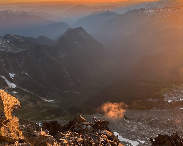 Our route descriptions indicated that this final section of the route was fourth class – we looked up at the steep ridge, only seeing options for legit fifth class rock climbing. With no time to screw around looking for easier options, Darren began block leading pitch after pitch of 5.0-5.7 terrain. We had hoped to be simulcimbing by now, but the climbing was hard enough (and the rock loose enough) that it was an easy choice to keep belaying. At the end of pitch 16, another short rappel bypassed steep snow and brought the summit into view, about 600 vertical feet above. With simul climbing mode finally engaged, we did three dangerously loose simul pitches straight to the summit. At one point, I watched with terror as Darren surfed atop a large boulder as it began sliding off the mountain while he was leading. Somehow the boulder stopped itself after a few feet and Darren carried on as if nothing had happened. I think we had been in serious, stressful terrain for so long that nothing was going to frazzle us at this point.