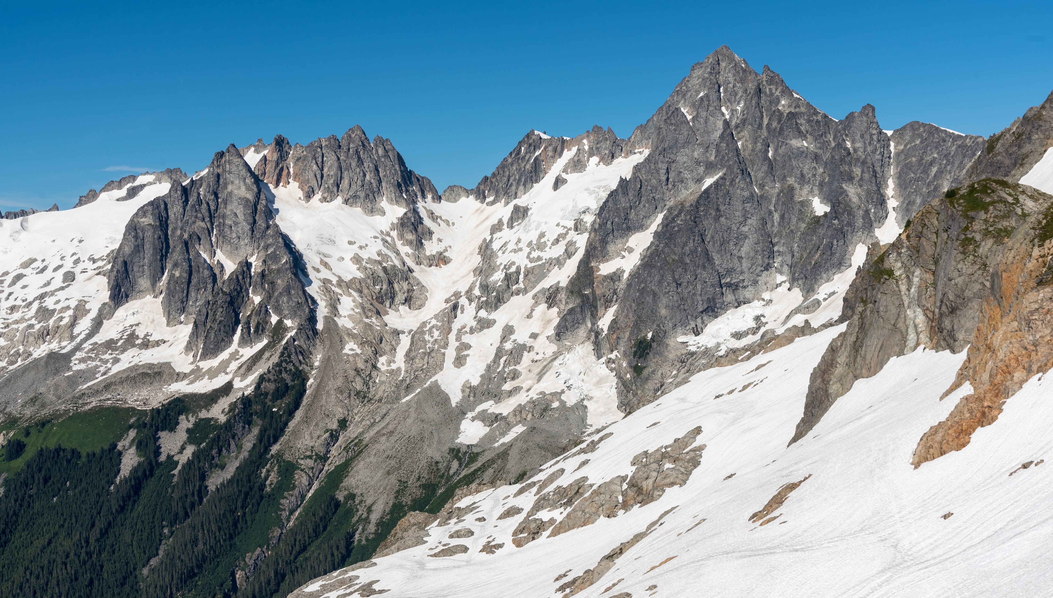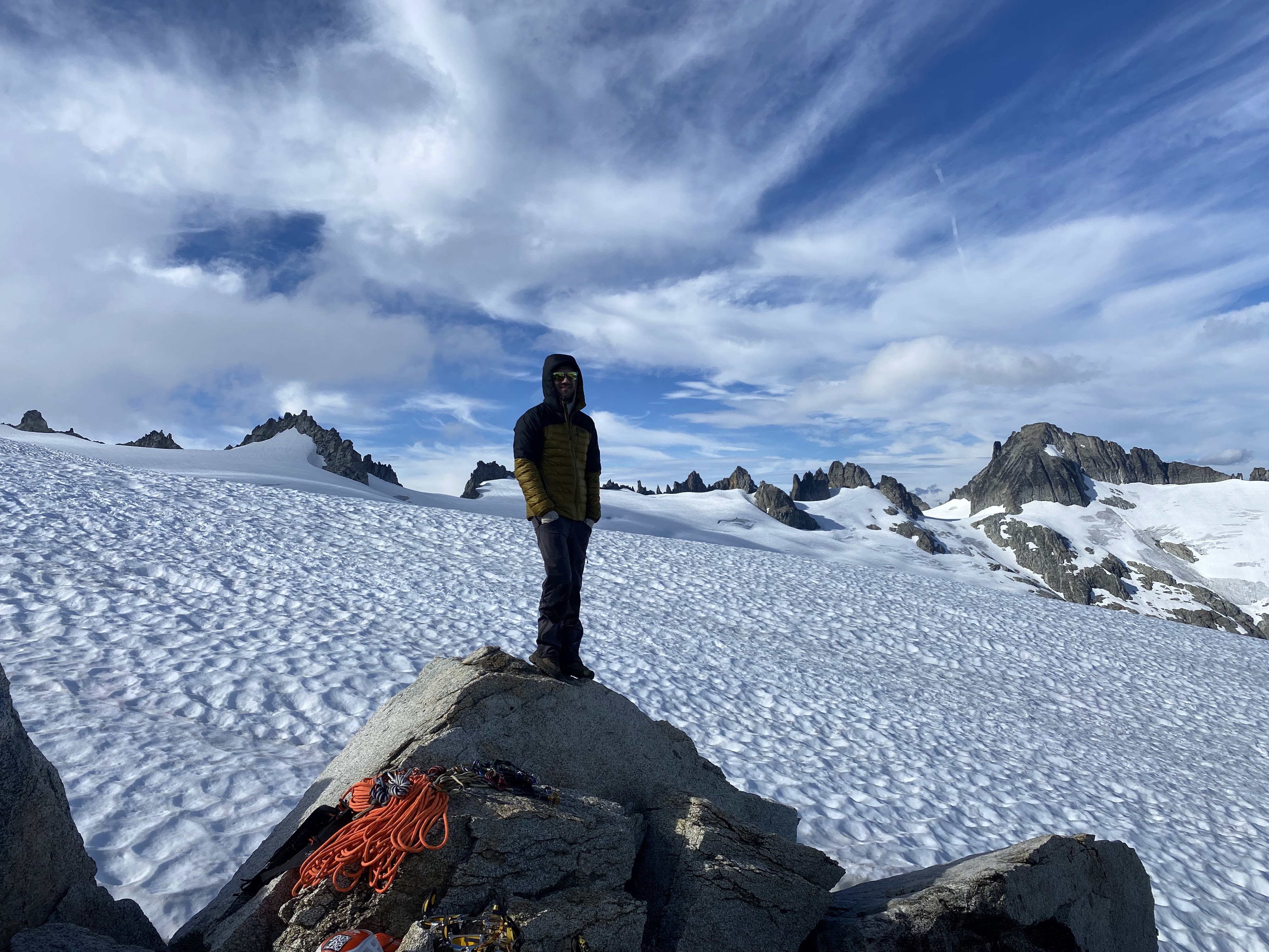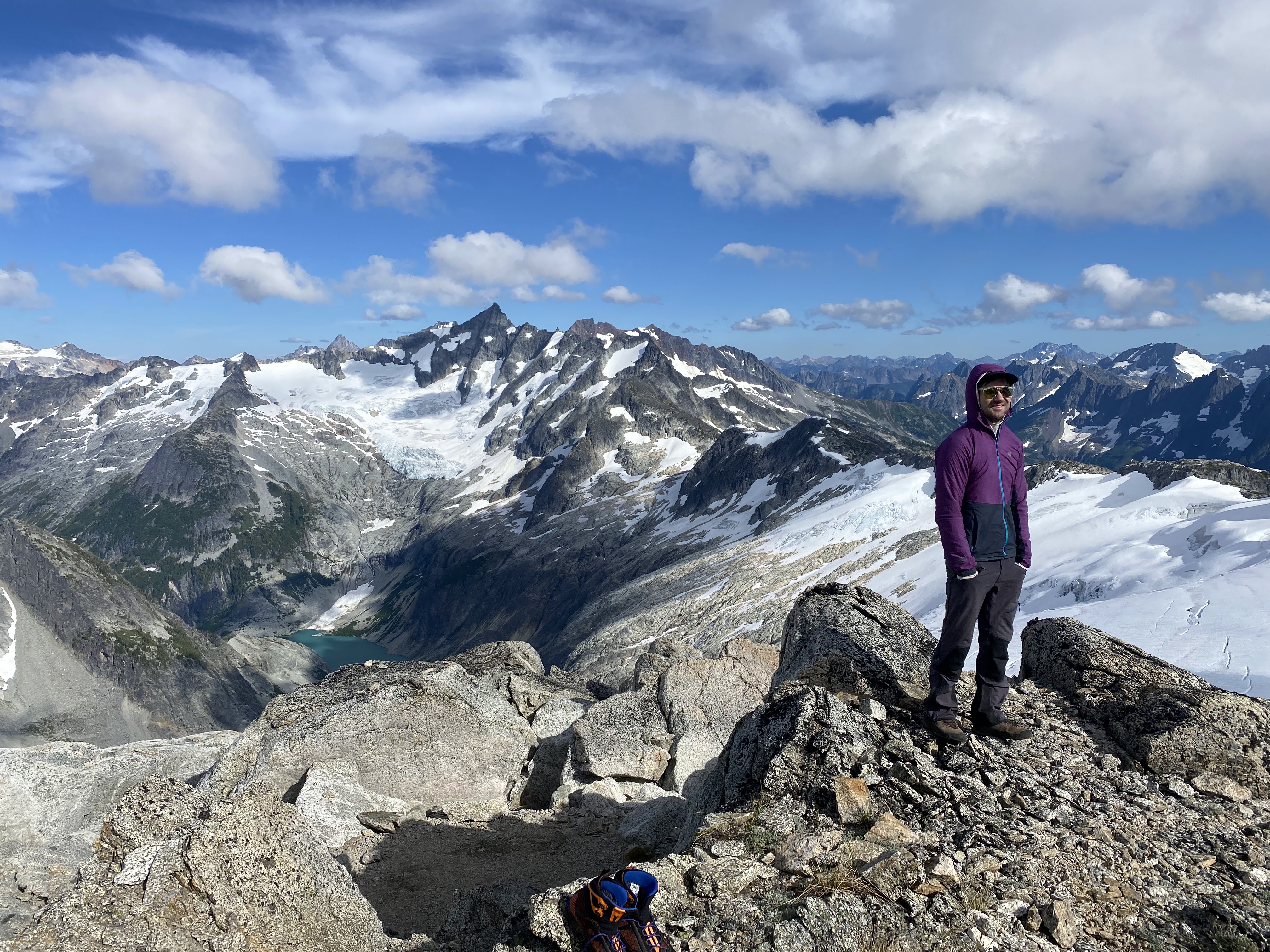 Eldorado Peak, the “Queen of the Cascade River” according to Fred Beckey, is a truly beloved mountain. The peak’s prominence and beauty command attention in an area already full of mind-blowing views – for my money, this is the most spectacular zone in the Cascades. Eldorado’s East Ridge provides an accessible and classic glacier route to the summit which allows many climbers to bask in the peak’s regal presence. Despite the popularity, most climbers have no idea that there is a dark side of Eldorado Peak: the West Face. Brooding over Marble Creek Cirque, the steep and rocky West Face has a completely different character than the friendly Eastern aspect. On this face, the West Arete is the route of choice for those bold or foolish enough to make an attempt, with 3000 feet of rock soaring directly to the summit. Darren Harnois and I climbed Eldorado Peak’s West Arete on July 26, 2025.