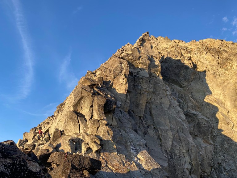 We climbed the route in 17 hours roundtrip from the base of Eldorado’s East Ridge. This route is a good candidate for mid-season climbs, when the route is snow-free and the days are long. After the climb, we tallied up 19 pitches including three long simul pitches.