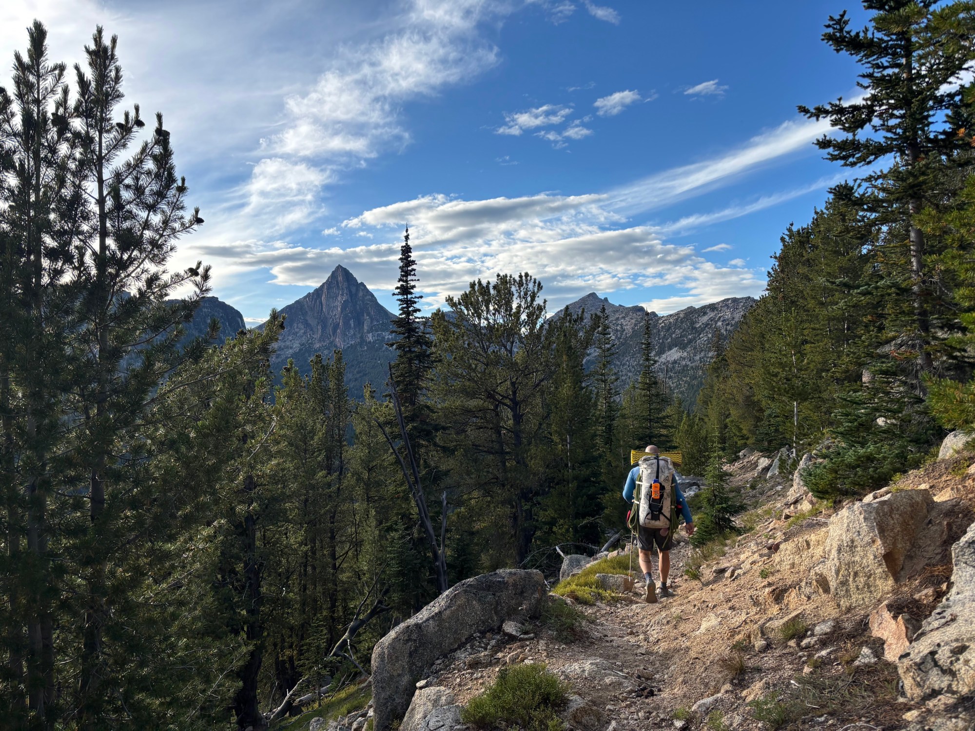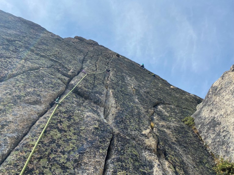 We used and recommend: doubles of cams .2-2, single 3, a light set of offset nuts and a 60m rope. You could easily drop the .2 cams but we did use them. Approach shoes aren’t really needed in this zone given the easy hiking and descents – comfortable trail runners make much more sense.