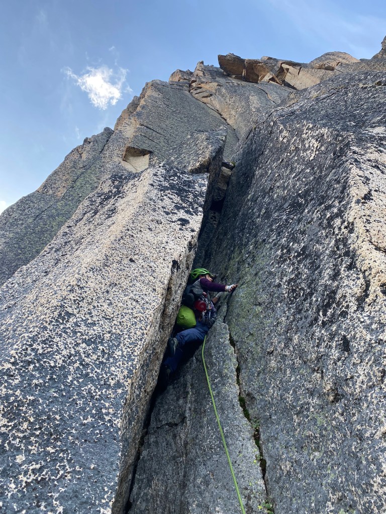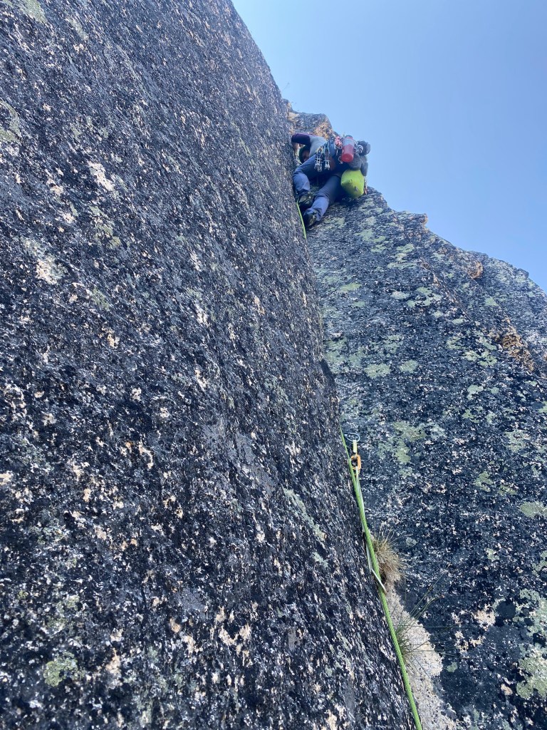 The day after Avi and I climbed Cathedral Peak, our motivation to climb remained high. With Ampitheatre Mountain’s Middle Finger Buttress only a stone’s throw from our tent, it was the obvious choice! Avi and I climbed Middle Finger Buttress via the “Left” route on September 1, 2025. Despite the incredibly bland name, this is a fun climb with an absolute classic first pitch.